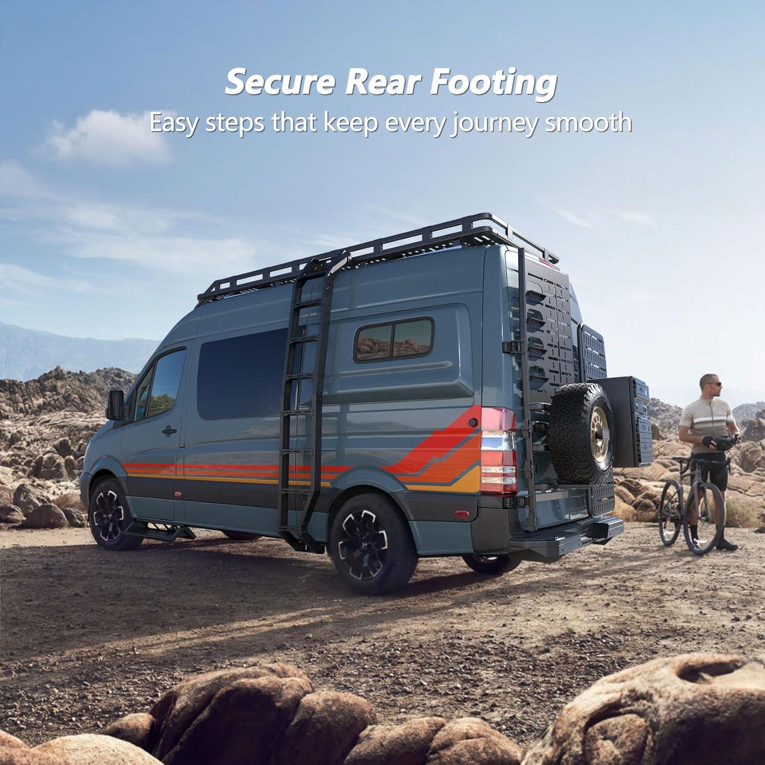 Board-Style Step:The plate-style design provides a wide, stable platform for safe and comfortable entry into your van. Its sturdy construction supports every step, while pairing perfectly with other VANNCAMP accessories like side ladders, rear tire carriers, and roof racks for a coordinated look and enhanced functionality