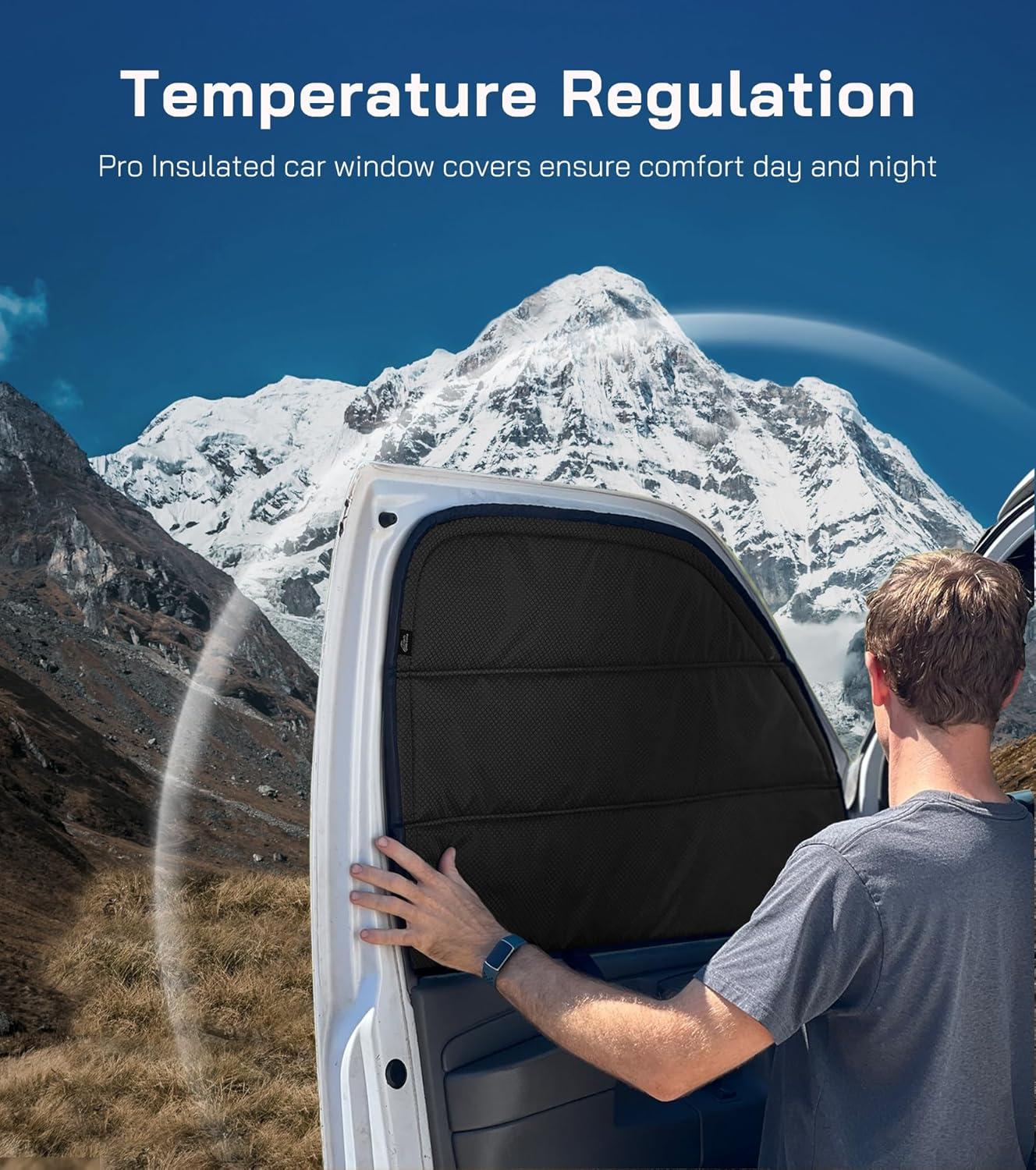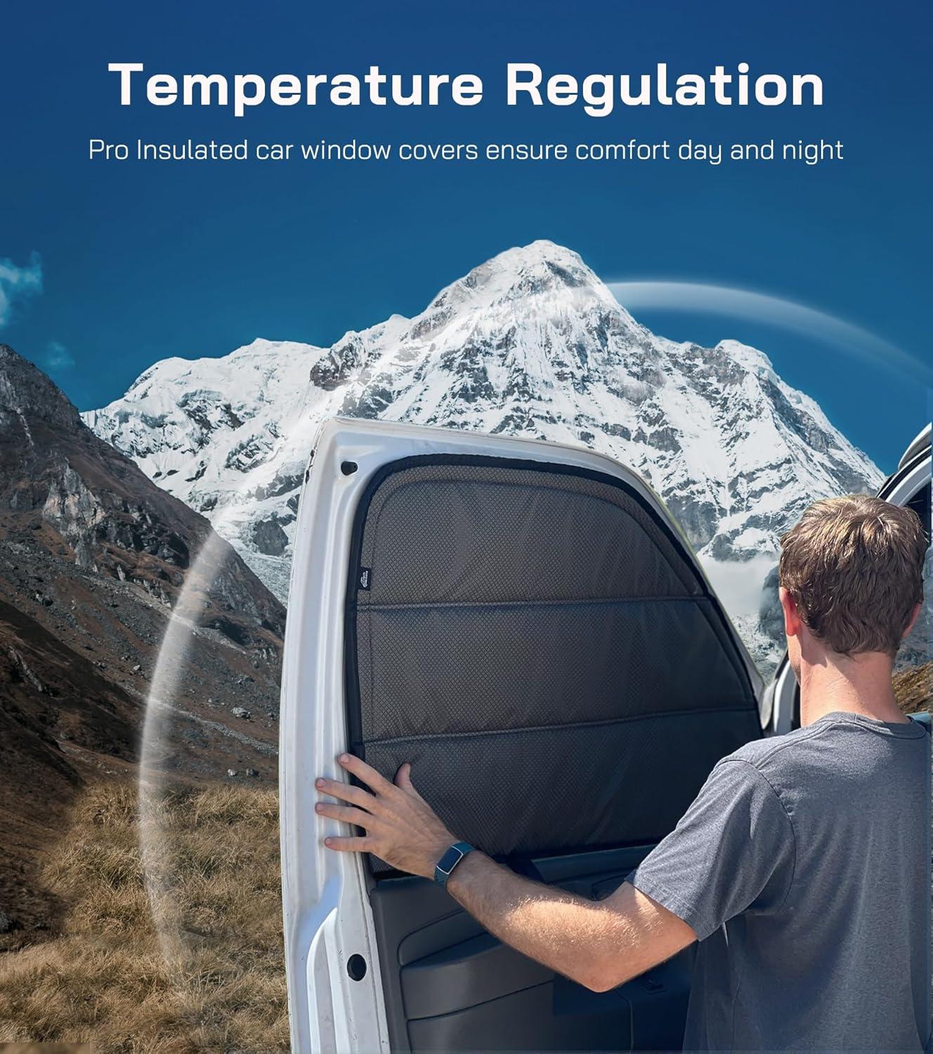 Temperature Regulation: This 3-season window cover is built with 5 layers of high-quality insulation, including an XPE foam core. It effectively blocks heat from entering in the summer and helps prevent heat loss during cooler nights—keeping your van interior comfortable year-round