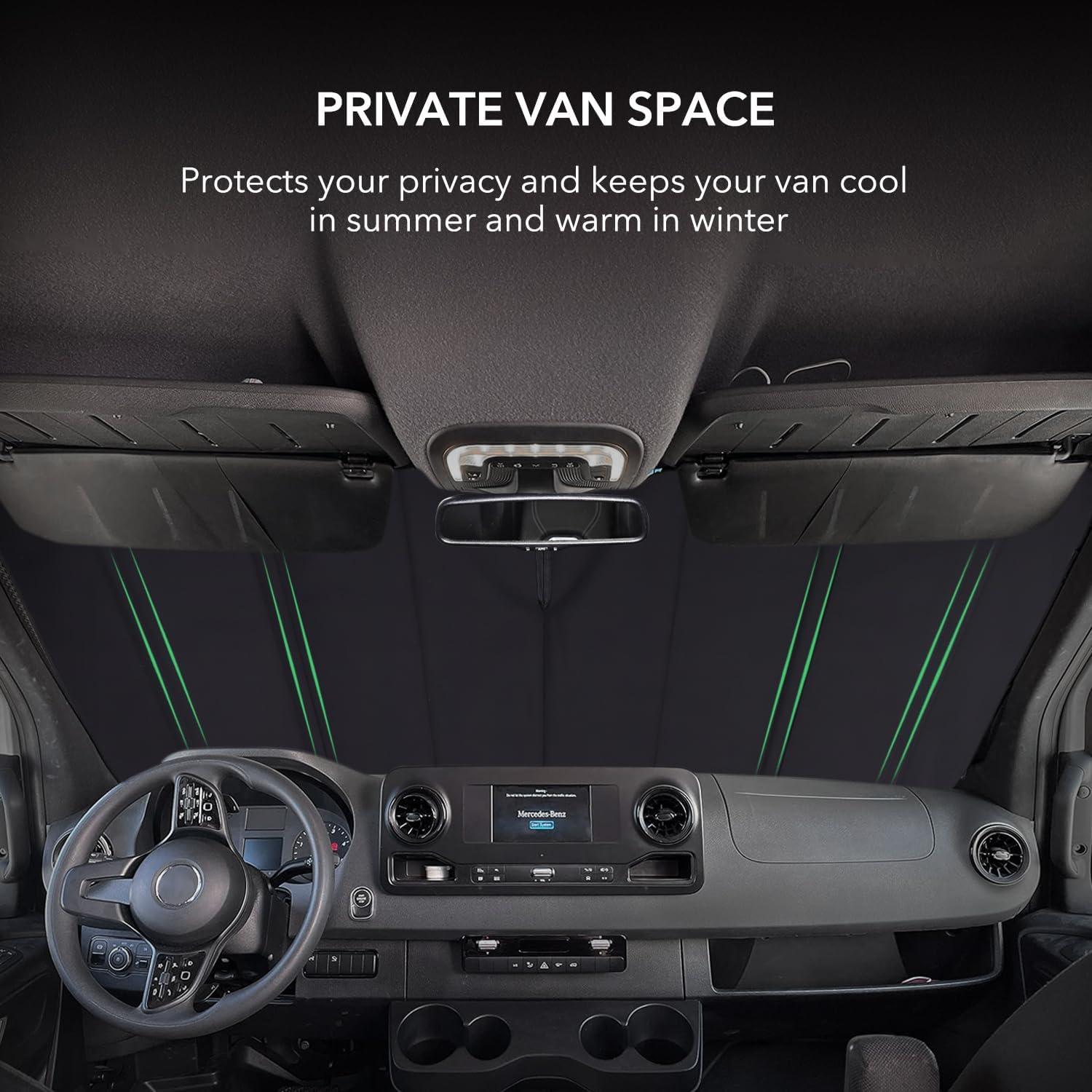 Total Privacy: Blocks sunlight completely and protects your interior from prying eyes. Extended side panels provide full coverage, creating a private, comfortable space inside your van