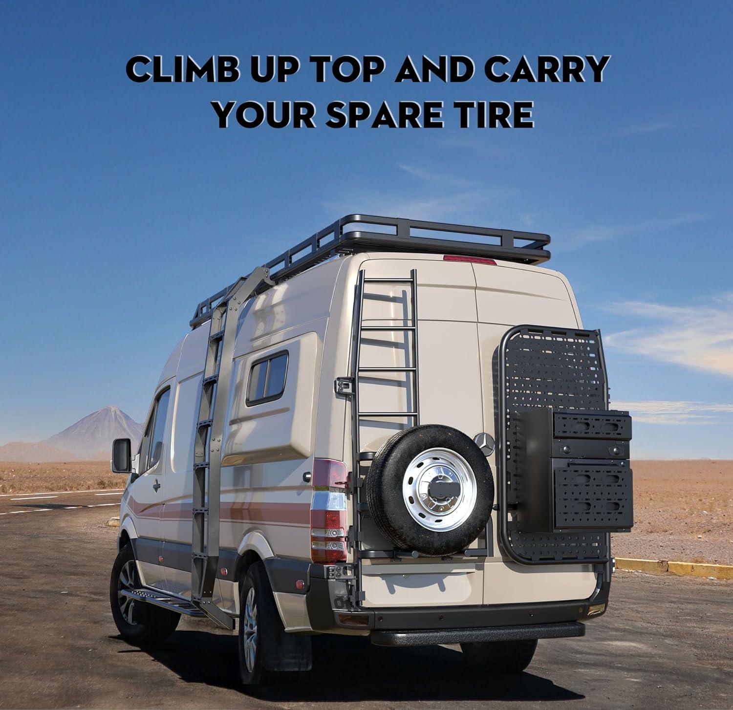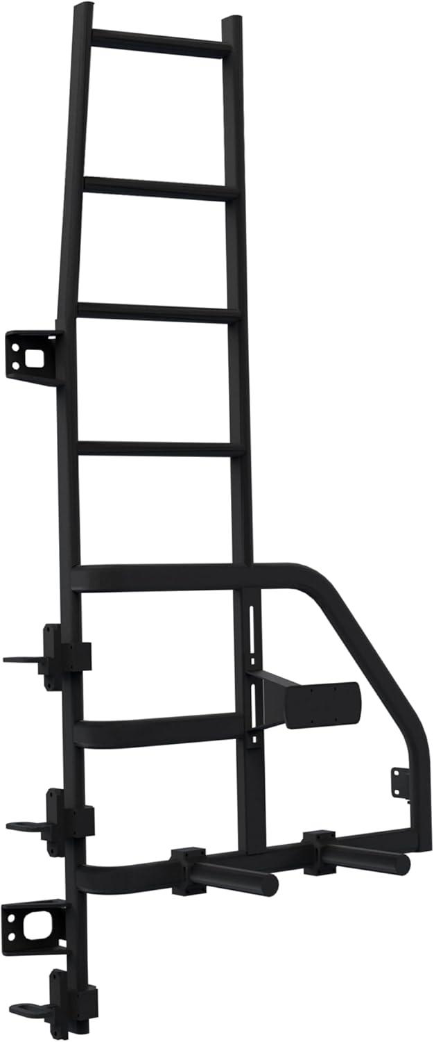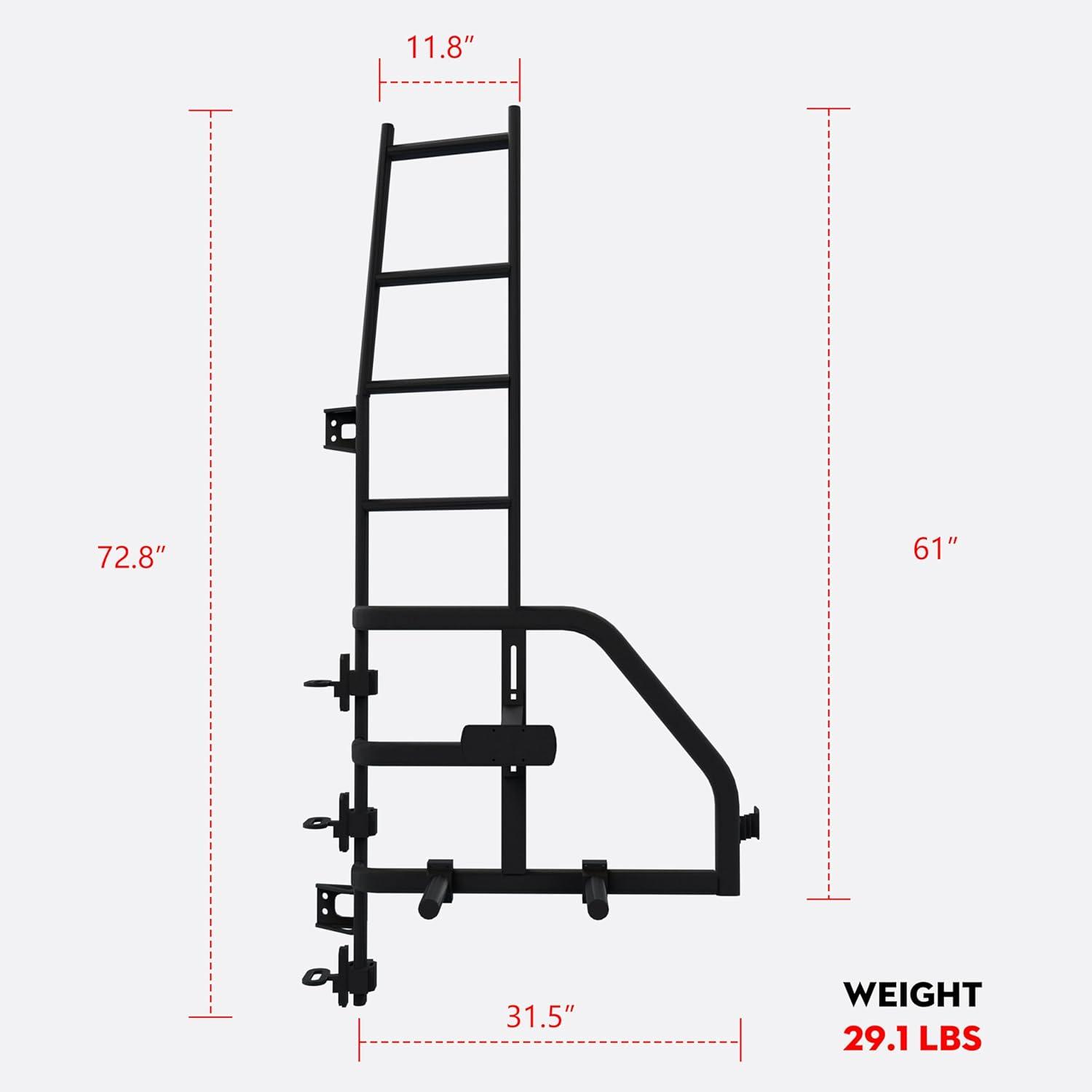 Multi-Functional Design: This 2-in-1 rear door ladder and tire carrier gives you easy roof access and a secure place for your spare tire. By combining two essential functions into one compact setup, it saves space and keeps your gear organized. Climb up to your rooftop deck with ease and enjoy the view, while your spare tire stays safely mounted and ready for the road