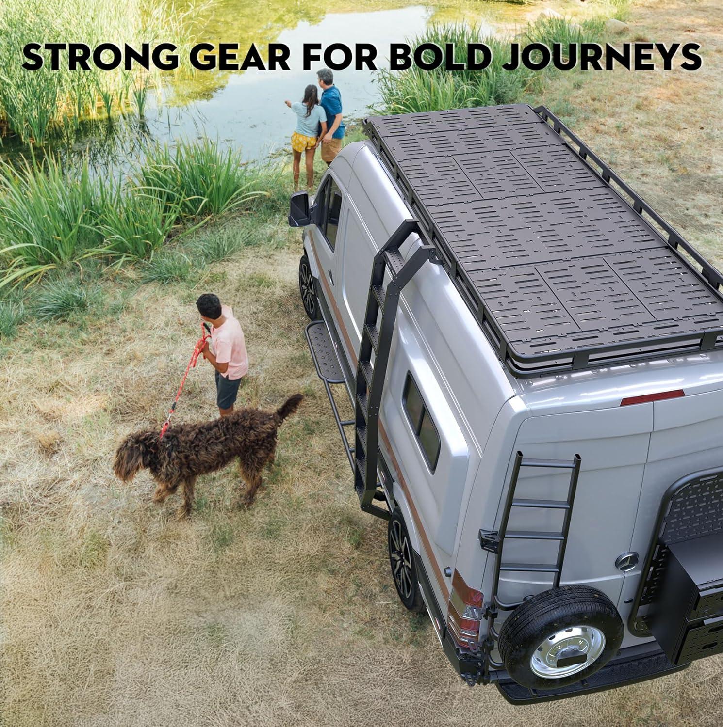 Durable Aluminum Build: Made from heavy-duty aluminum for superior strength and long-term durability—without the extra weight of steel. This lightweight build helps improve fuel efficiency and reduces strain on your van. A weather-resistant powder-coated finish and stainless steel hardware provide added protection against rust, rain, and harsh road conditions