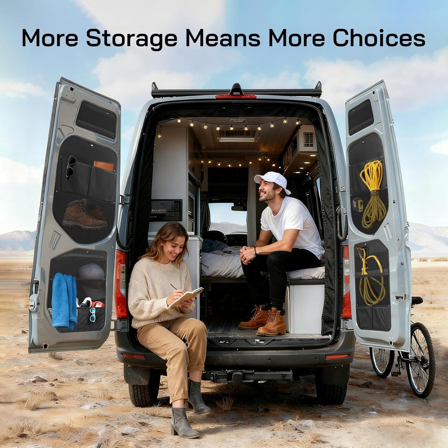 Smart Storage: Fine nylon mesh pockets + extra hanging loops hold tools, bottles, cables, and daily vanlife essentials; large capacity keeps your rear doors organized and easy to access