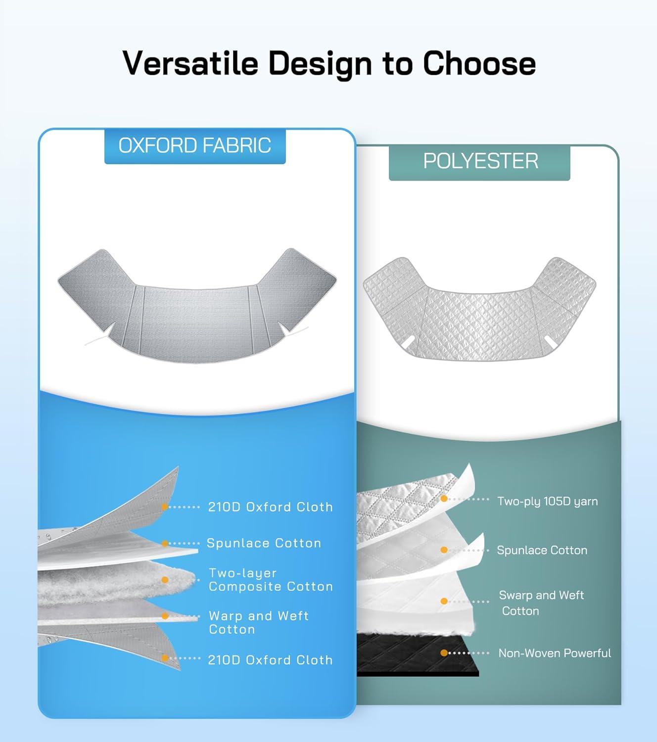 Newly Upgraded Five Layer Material: The inner and outer layers are made of 210D Oxford fabric that can withstand water pressure up to 4,000 Pa and temperatures up to 140°F.The three layers of cotton in between obstruct hot and cold air, ensuring temperature stability within the vehicle
